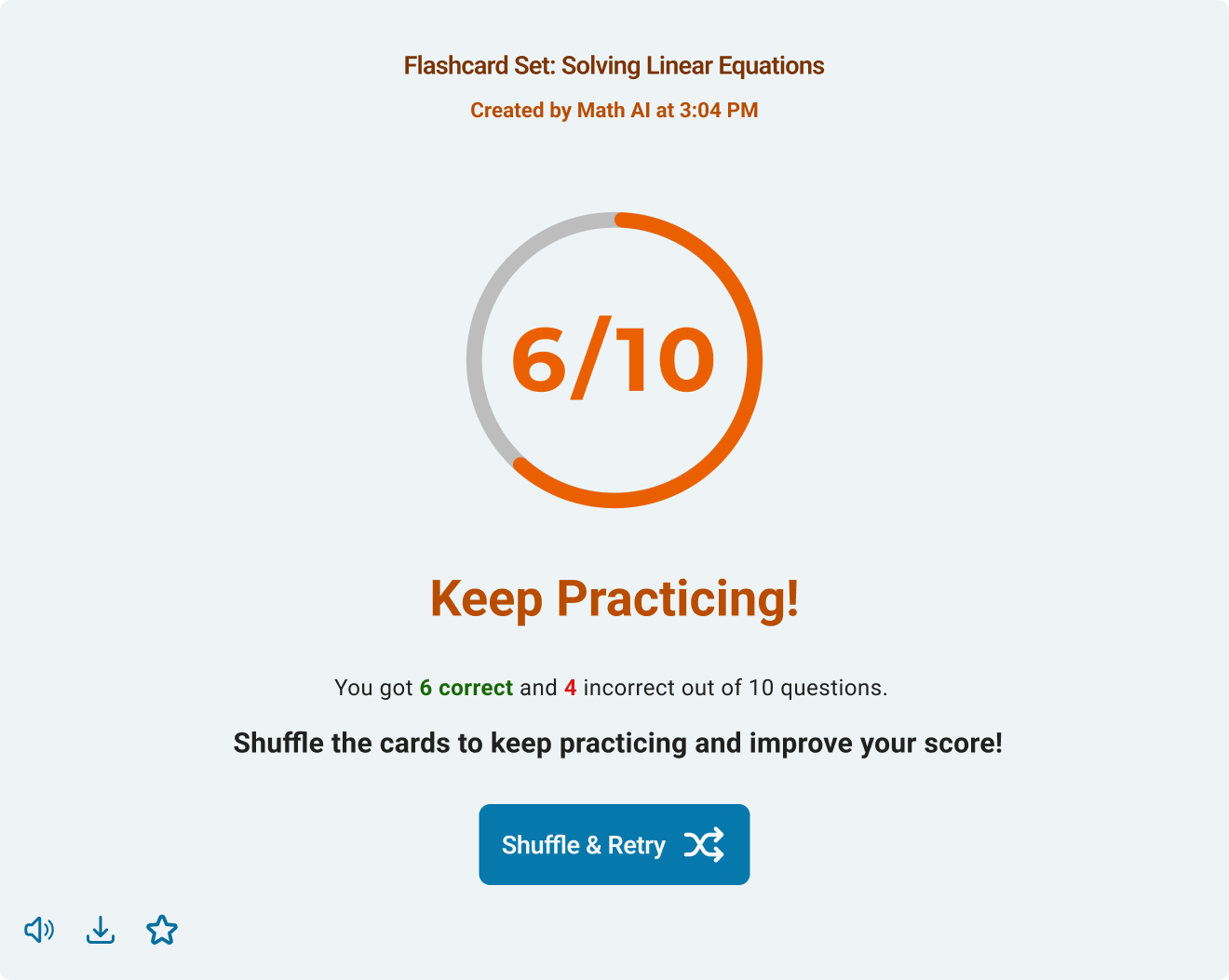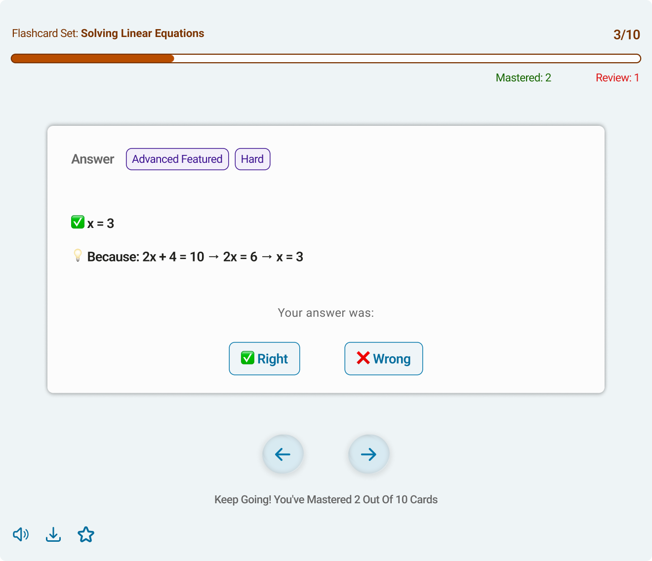 Students didn’t have any sense of progress while practicing with flashcards. I redesigned the flow to include progress tracking and feedback at the end of each deck, giving students a score, encouragement, and the option to retry.
