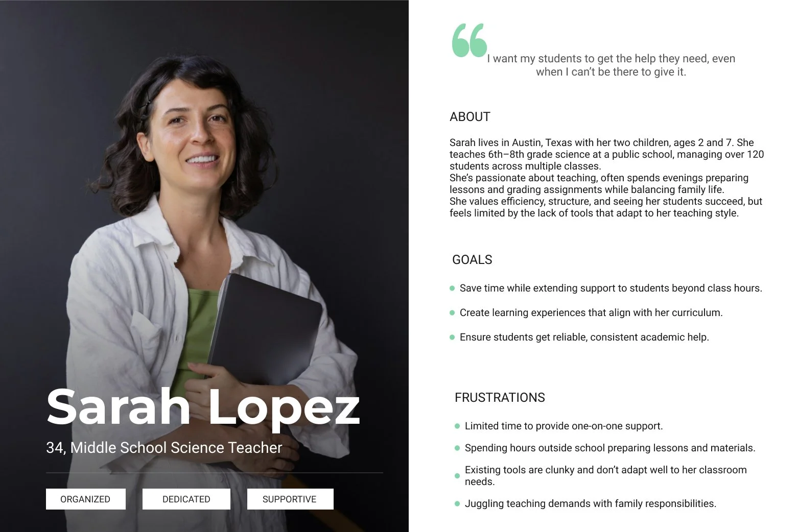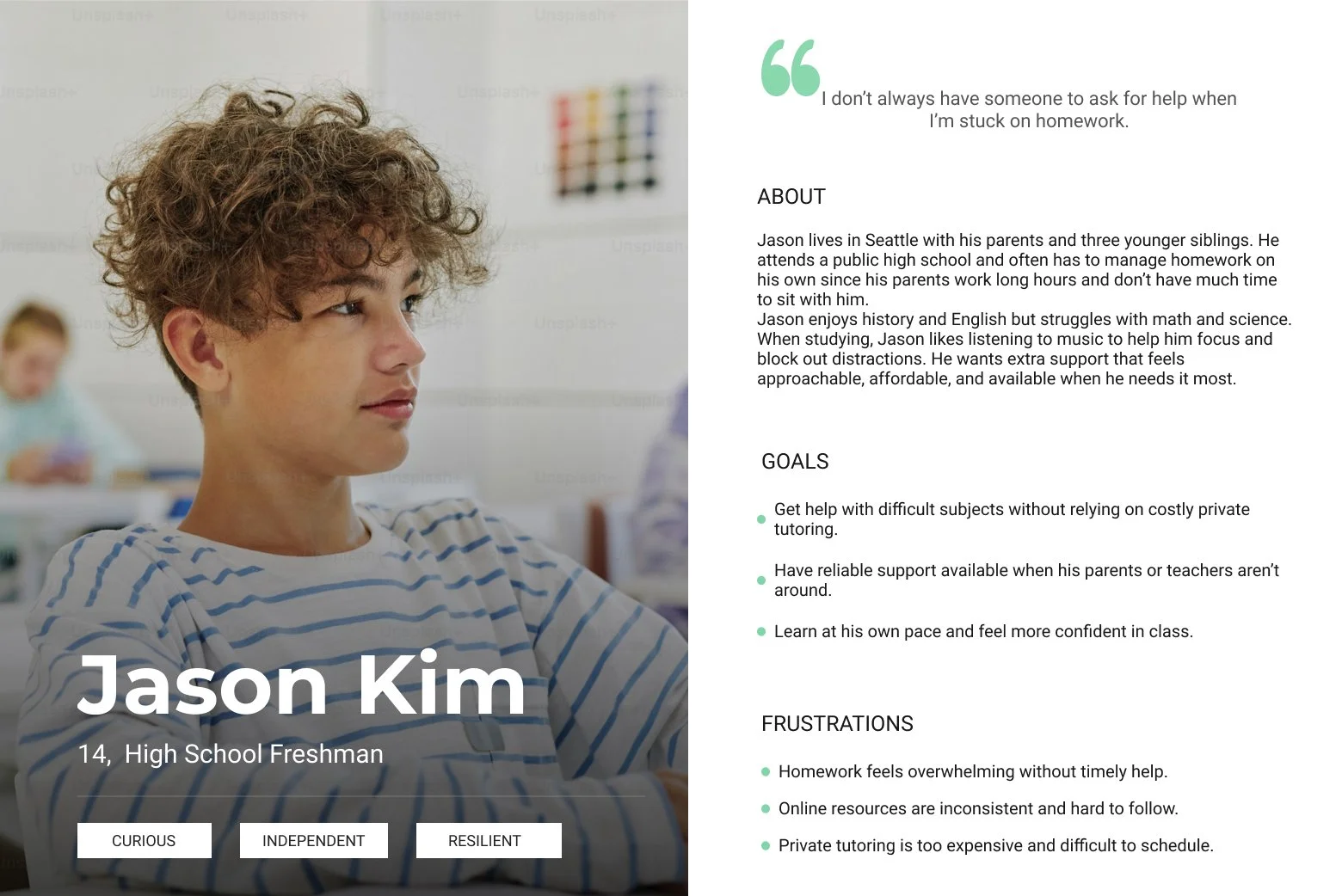 To ground the design process, I worked with insights provided by EduSeek’s UX research team. Using their findings, I helped synthesize findings into two core personas: students and teachers.